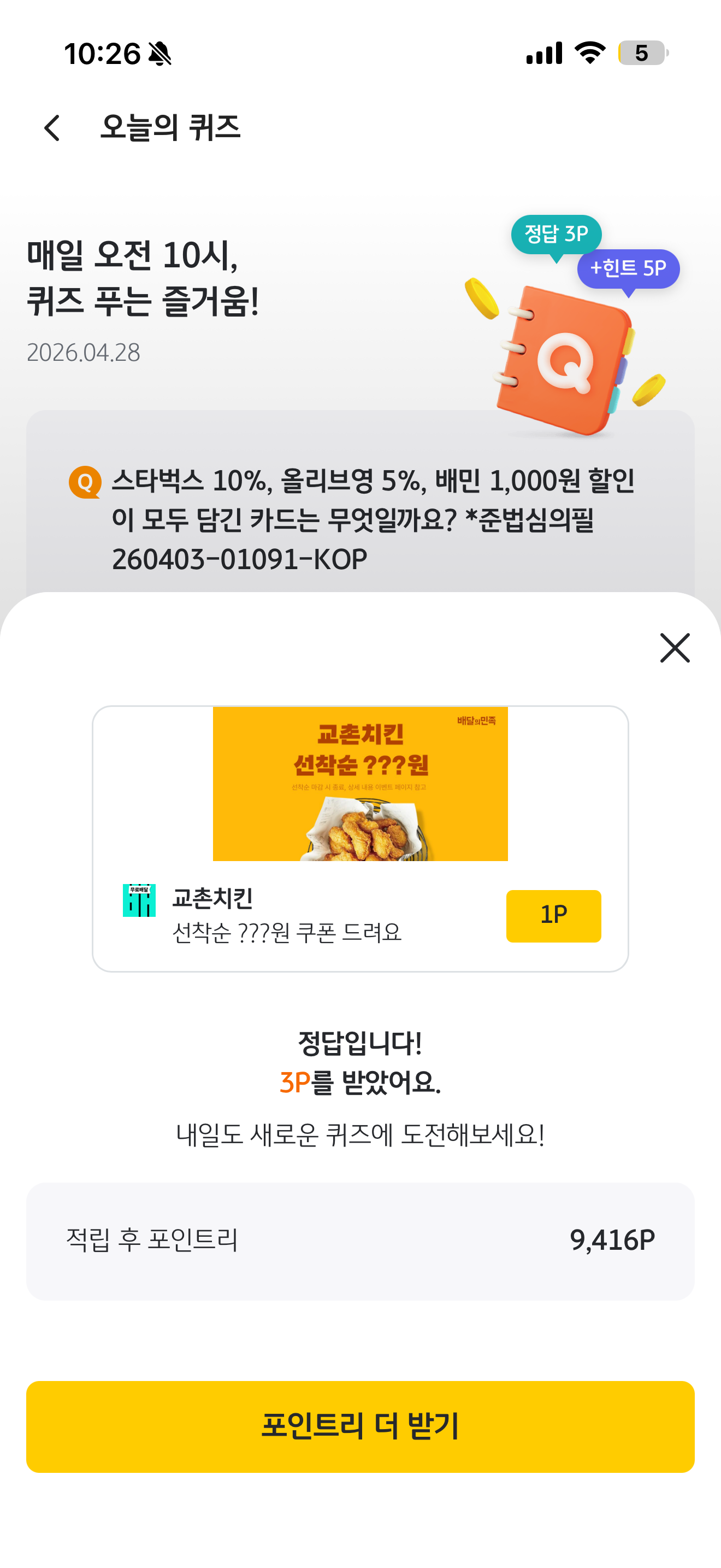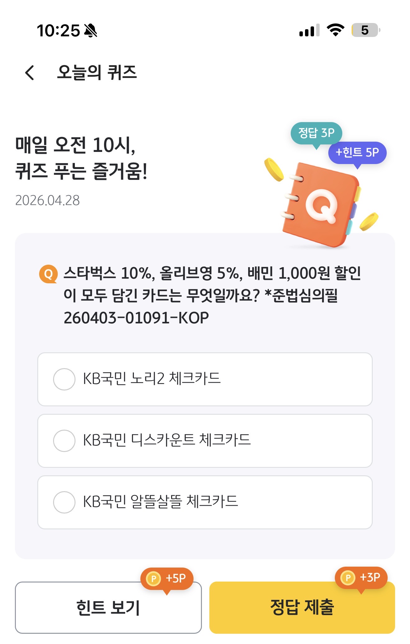 스타벅스 10%, 올리브영 5%, 배민 1,000원 할인이 모두 담긴 카드는 무엇일까요? *준법심의필260403-01091-KOP 보기는 1. KB국민 노리2 체크카드 2. KB국민 디스카운트 체크카드 3. KB국민 알뜰살뜰 체크카드 입니다