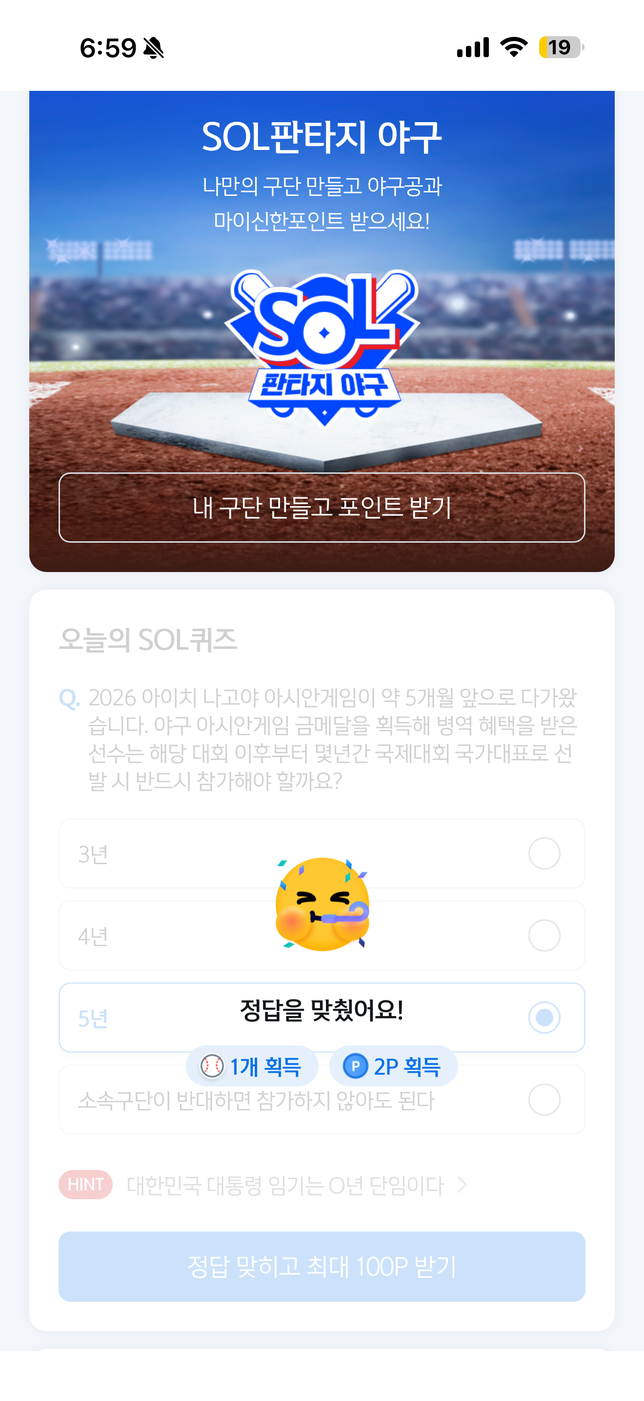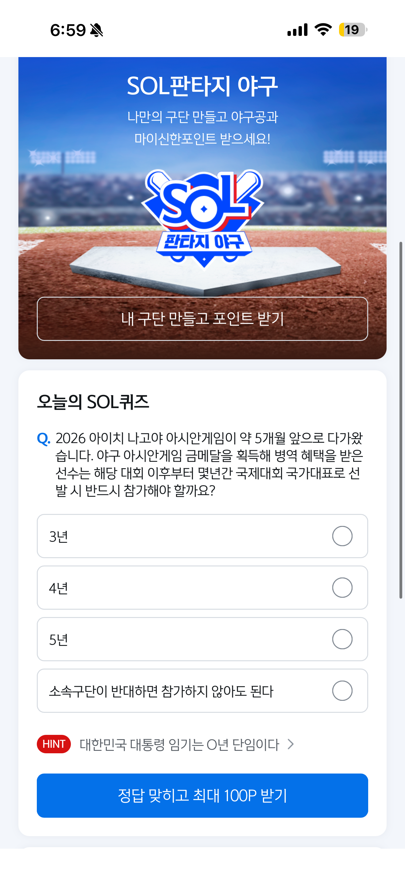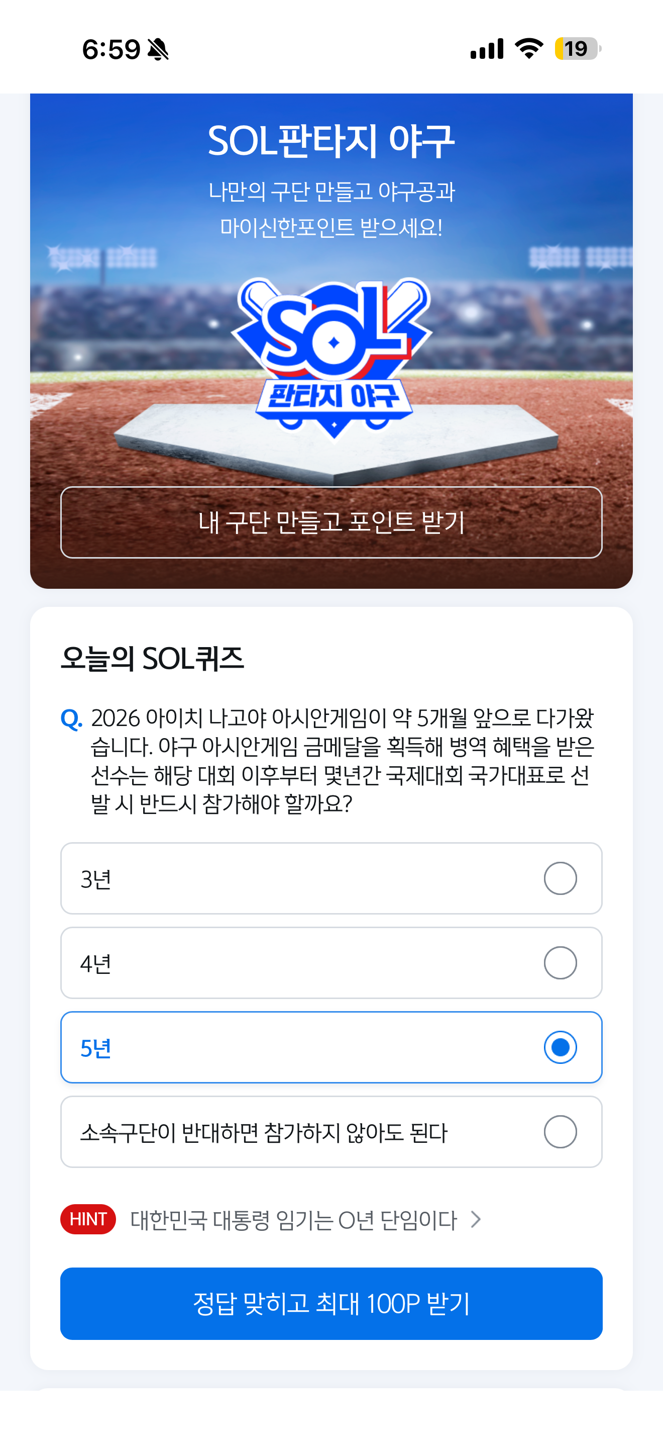 신한은행 SOL야구 쏠퀴즈 정답은 5년 입니다