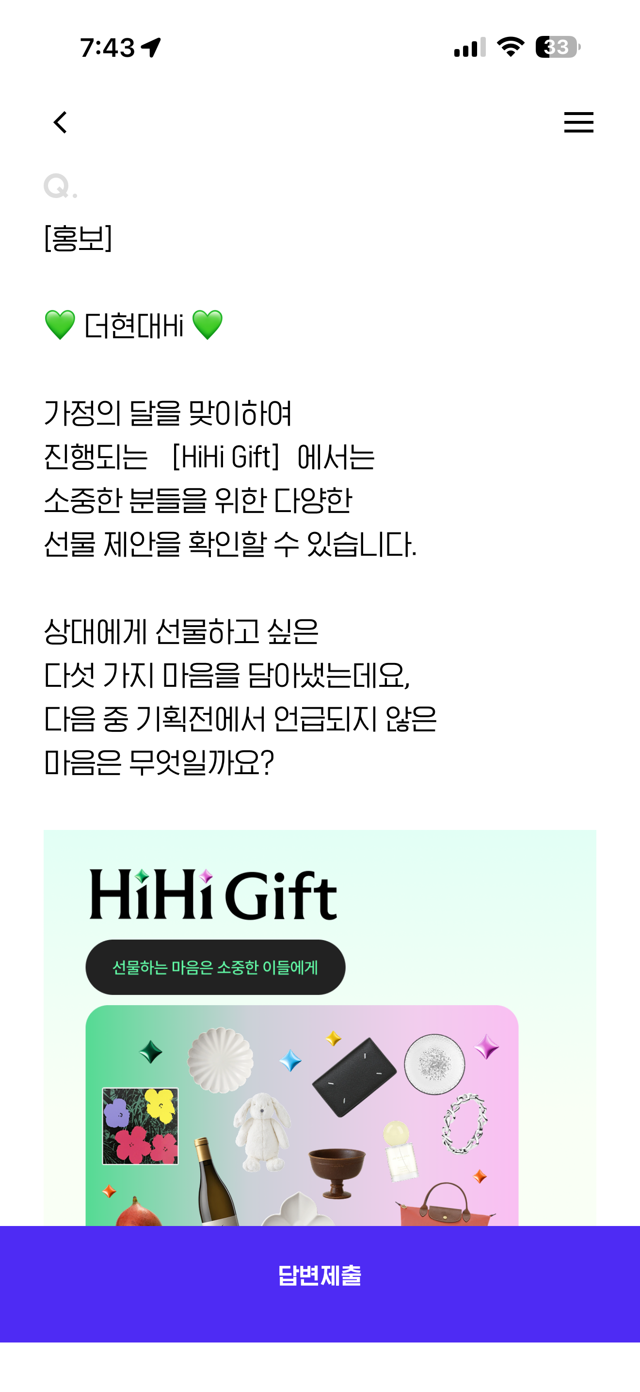 가정의 달을 맞이하여 진행되는 [HiHI Gift] 에서는 소중한 분들을 위한 다양한 선물 제안을 확인할 수 있습니다. 상대에게 선물하고 싶은 다섯 가지 마음을 담아냈는데요, 다음 중 기획전에서 언급되지 않은 마음은 무엇일까요?