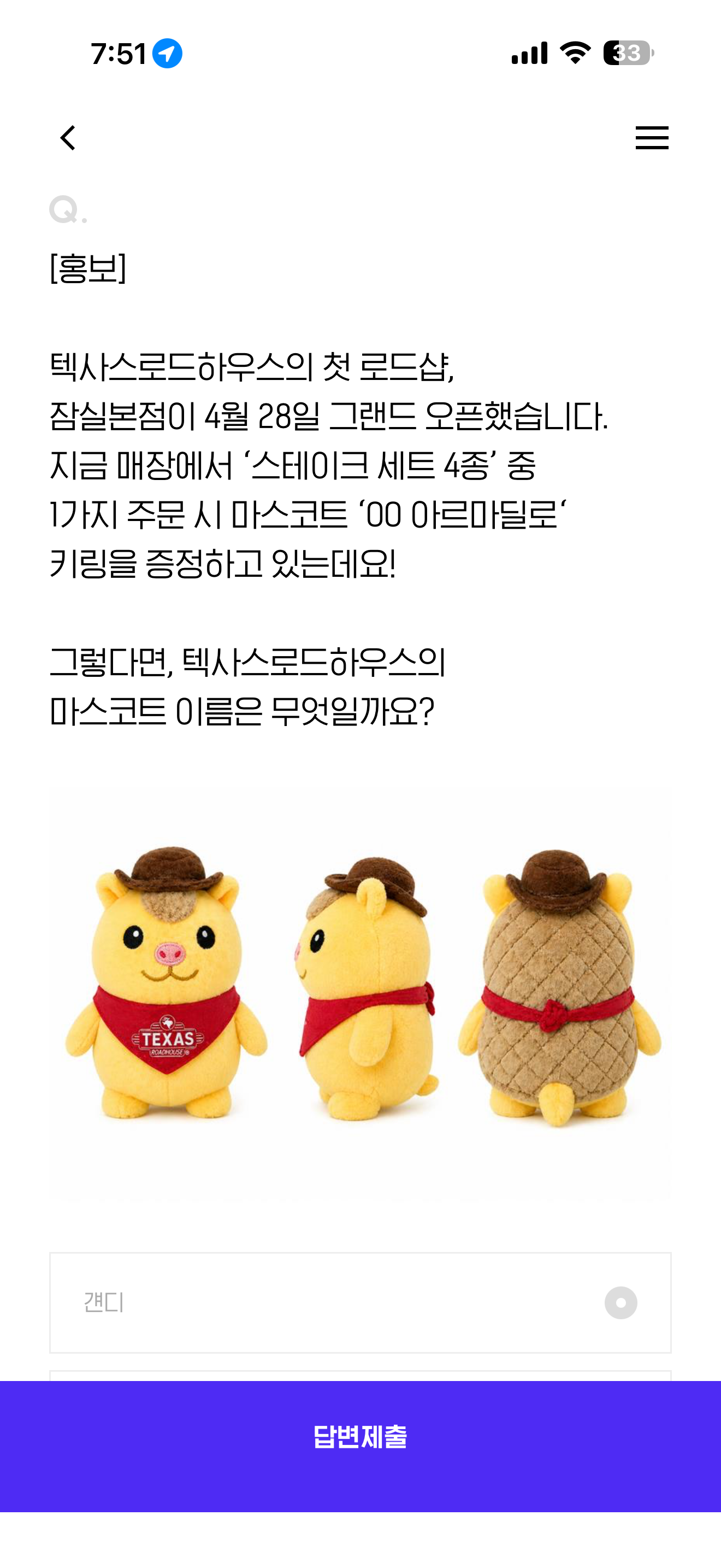 텍사스로드하우스의 첫 로드샵, 잠실본점이 4월 28일 그랜드 오픈했습니다. 지금 매장에서 '스테이크 세트 4종' 중 1가지 주문 시 마스코트 '00 아르마딜로' 키링을 증정하고 있는데요! 그렇다면, 텍사스로드하우스의 마스코트 이름은 무엇일까요?