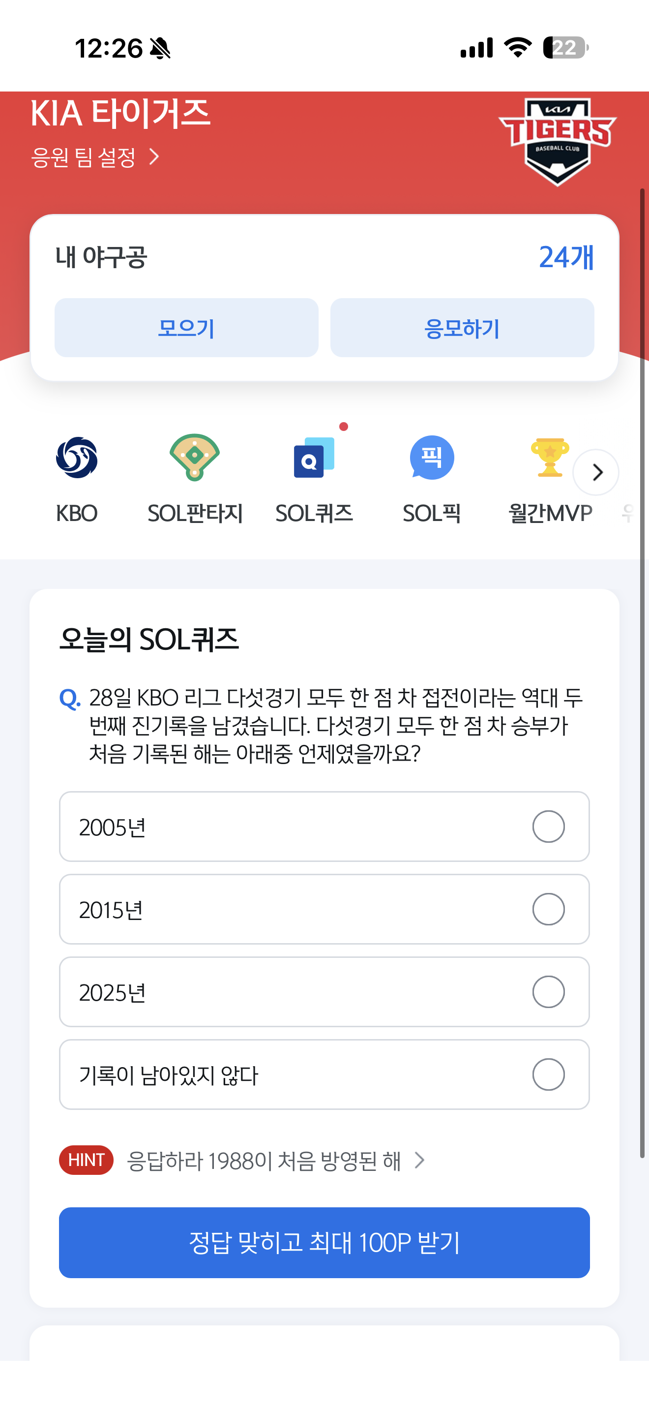 신한은행 SOL야구 쏠퀴즈 5월 1일 정답(28일 KBO 리그 다섯경기 모두 한 점 차 접전이라는 역대 두번째 진기록을 남겼습니다. 다섯경기 모두 한 점 차 승부가 처음 기록된 해는 아래중 언제였을까요?)