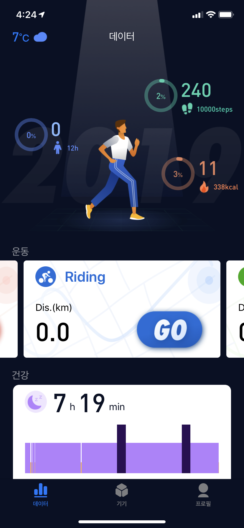 메인 화면에는 얼마나 서있었는지, 얼마나 걸었는지, 칼로리 소모는 어떤지 수치로 나오고 , 운동메뉴, 취침 기록, 심박동 상태를 확인할 수 있습니다. 화면 디자인도 예쁘고 섬세한 앱을 지원해 진정한 가성비 좋은 스마트밴드의 매력을 만날 수 있습니다.