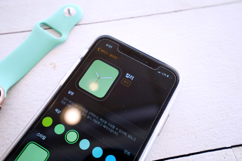 원하는 컬러를 선택하고 추가를 누르면 바로 애플워치 워치페이스가 변경됩니다. 스피어민트 컬러가 따로 있으니 스피커민트 스포츠 밴드는 해당 색상을 선택해서 추가하면 됩니다.