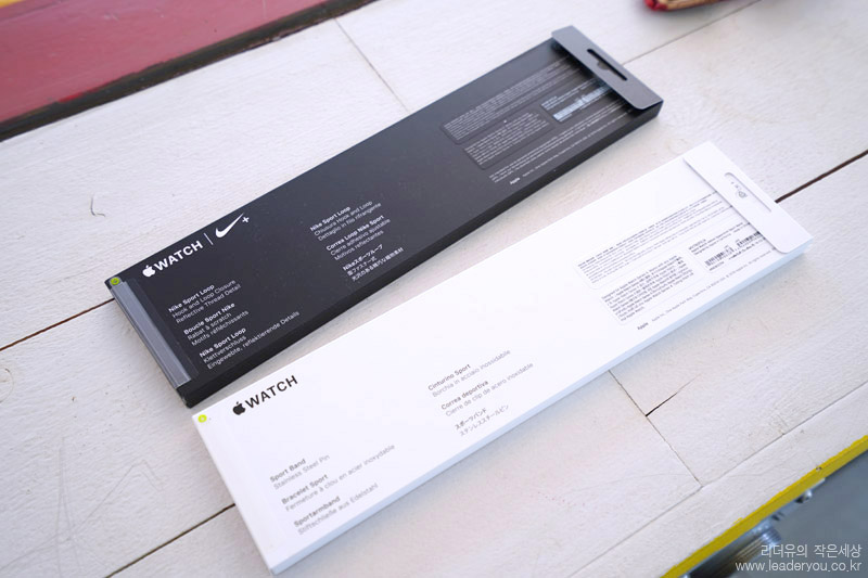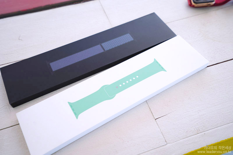 애플워치 스프링 시즌 밴드 2종 패키지입니다. 검정색은 애플워치 나이키 플러스 하이퍼 그레이프 패키지이고 하얀색은 애플워치 스포츠 밴드 스피어 민트 패키지입니다. 패키지 겉면에 어떤 색상인지 보여주고 있으니 느낌을 쉽게 알 수 있습니다.