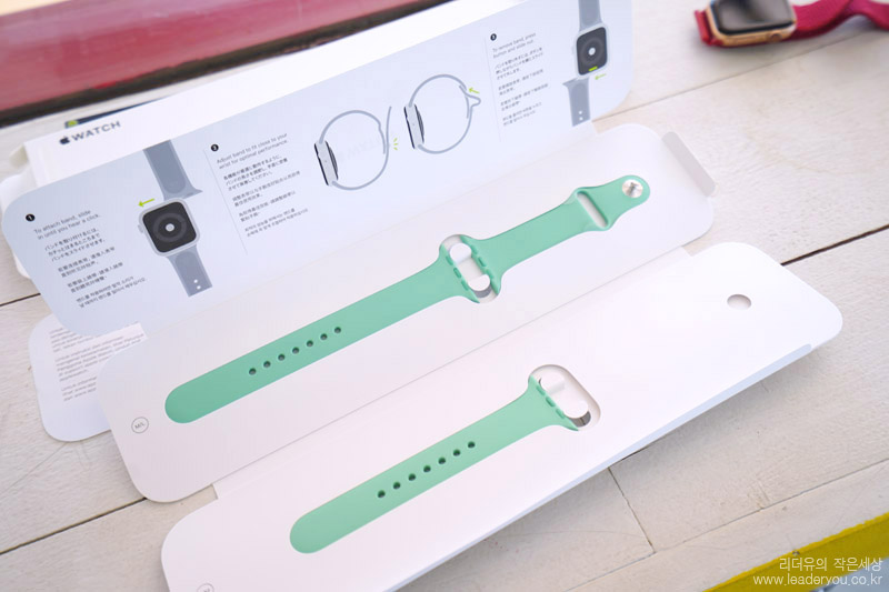애플워치 스포츠 밴드 스피어민트를 개봉하면 이렇게 포장되어 있습니다. 손목이 얇은 사람을 위해 짧은 밴드가 하나더 추가 되어 있습니다.