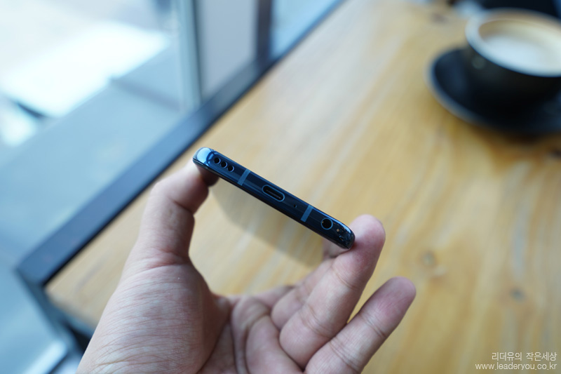 LG G8 아랫면에는 USB-C 단자, 이어폰 단자, 스피커가 있습니다. LG G8은 독특하게 하단 스피커와 전면 크리스털 사운드 올레드로 스테레오 사운드를 경험할 수 있습니다.