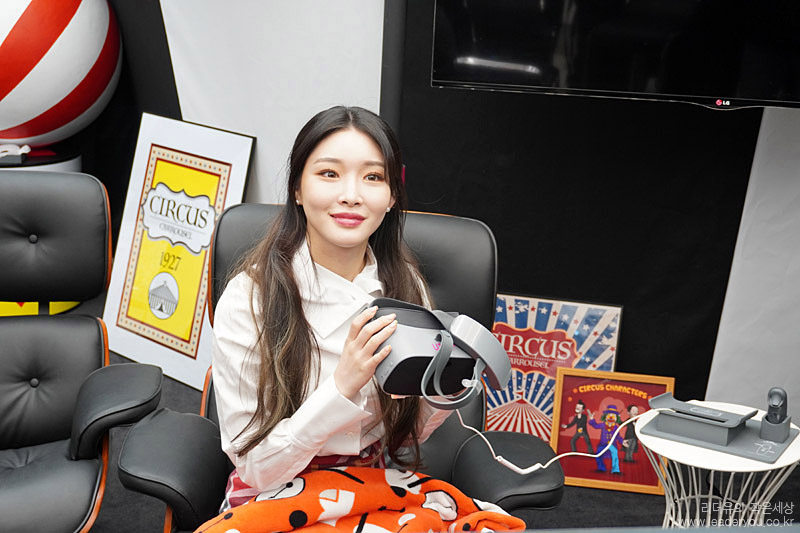 기념촬영으로 청하가 VR기기를 착용하는 모습입니다. 유플러스 5G 서비스를 보면 VR 기기를 통해 가상현실을 생생하게 만나거나 게임 등 다양한 서비스를 경험할 수 있습니다.