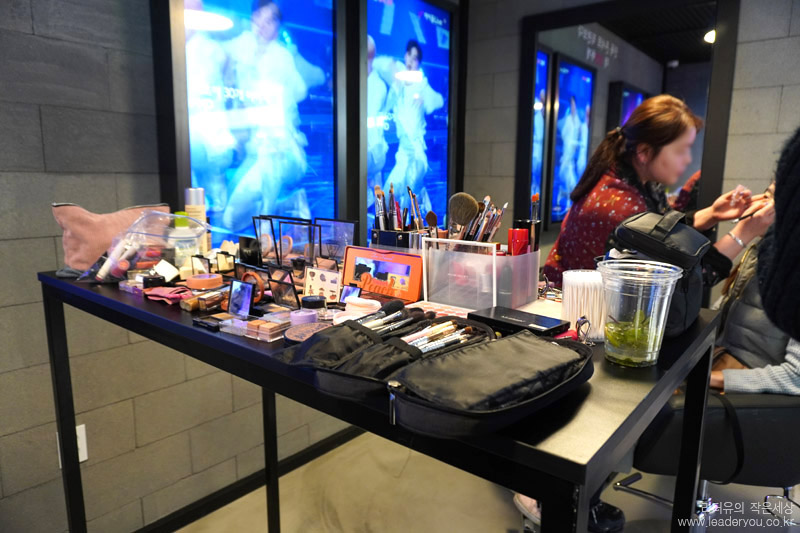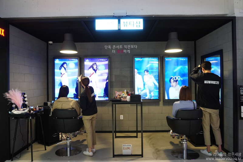 2층에는 아이돌 뷰티샵이 마련되어 있습니다. 편하게 앉아서 아이돌 멤버를 골라가면서 집중적으로 볼 수 있는 곳인데요. 이날 원하는 사람들에게는 메이크업 서비스도 제공해 더욱 특별한 시간이 되었습니다.