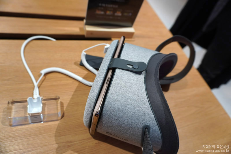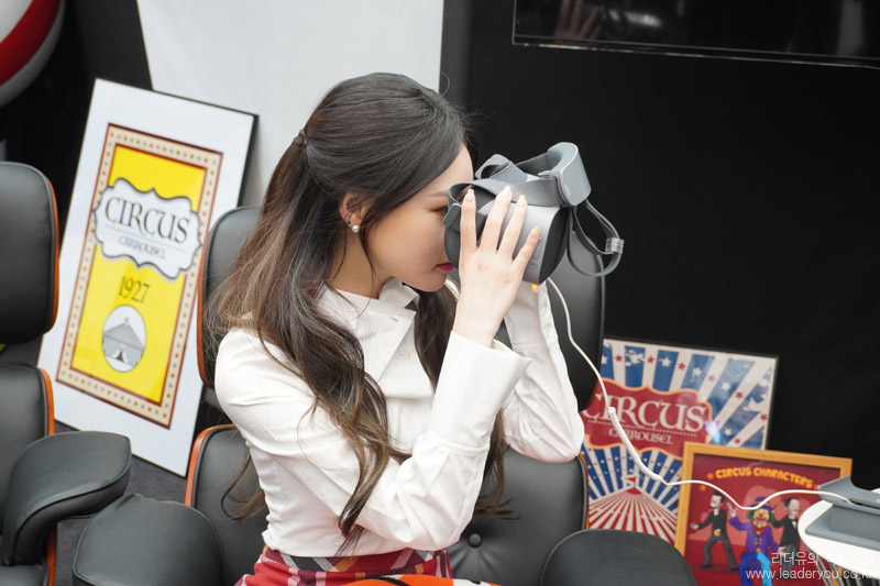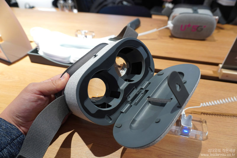기념촬영으로 청하가 VR기기를 착용하는 모습입니다. 유플러스 5G 서비스를 보면 VR 기기를 통해 가상현실을 생생하게 만나거나 게임 등 다양한 서비스를 경험할 수 있습니다.