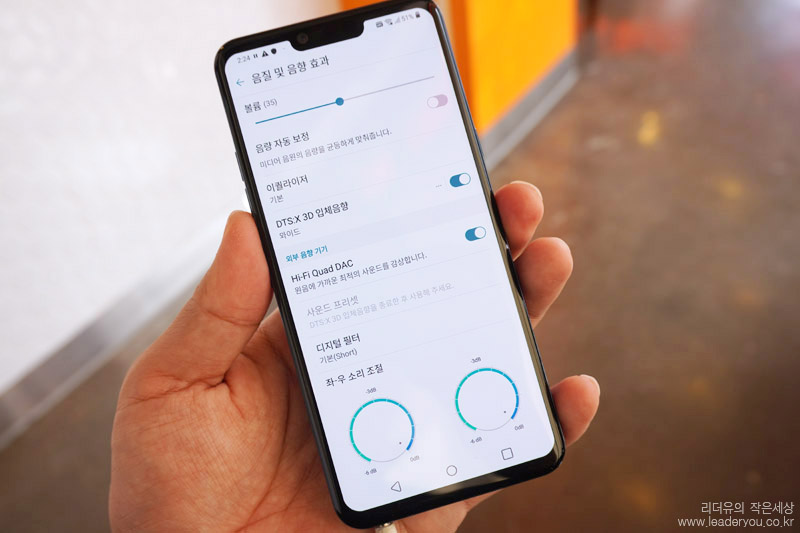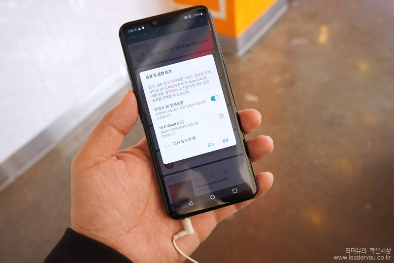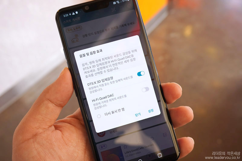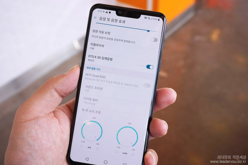 LG 스마트폰의 확실한 경쟁력이라 할 수 있는 부분은 Hi-Fi Quad DAC 이 들어 갔다는 것입니다. 음질 및 음향 효과를 극대화 해주는 매력적인 기능인데요. 이 기능은 유선 이어폰을 꼽으면 선택이 가능합니다.