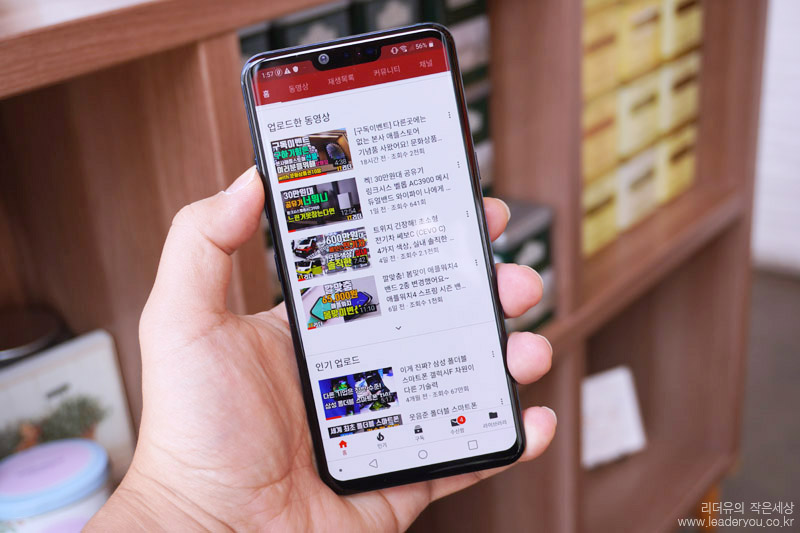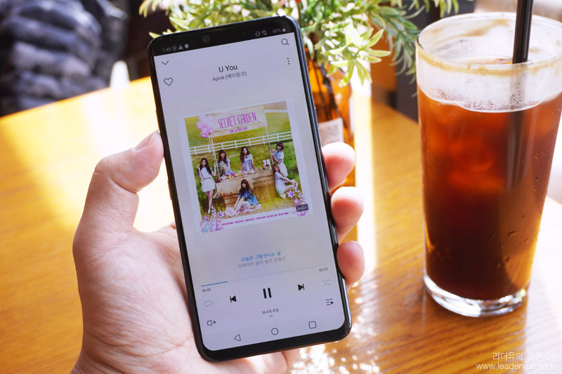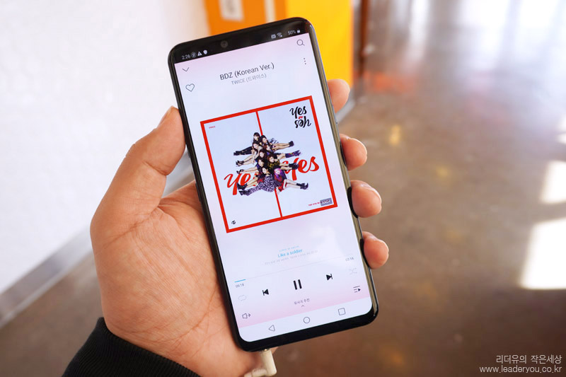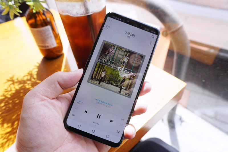 그래서 이렇게 음악 감상을 할때도 LG G8 ThinQ는 화면 자체에서 소리가 나고 하단의 스피커를 통해 스테레오 사운드를 들려줍니다. 음질도 괜찮아서 새로운 매력을 느낄 수 있는 크리스털 사운드 올레드 입니다.