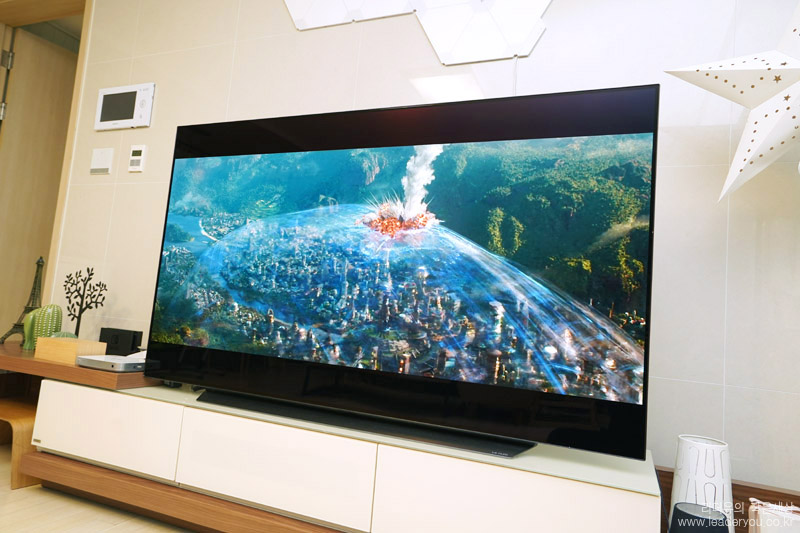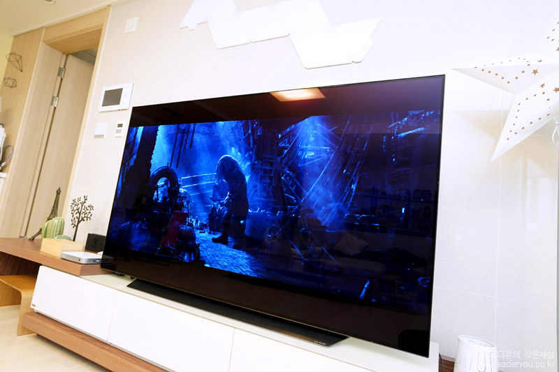 그리고 시야각도 놀랍습니다. 백라이트가 있는 LCD의 경우 시야각이 좋아도 이렇게 어두운 화면을 볼 때는 빛이 번지는 현상이 있는데 2019 LG 올레드TV AI ThinQ는 그런 문제가 전혀 없습니다. 이렇게 어두운 화면을 측면에서 봐도 선명합니다. 진정한 퍼펙트 시야각을 느낄 수 있는 2019 LG 올레드TV AI ThinQ입니다.