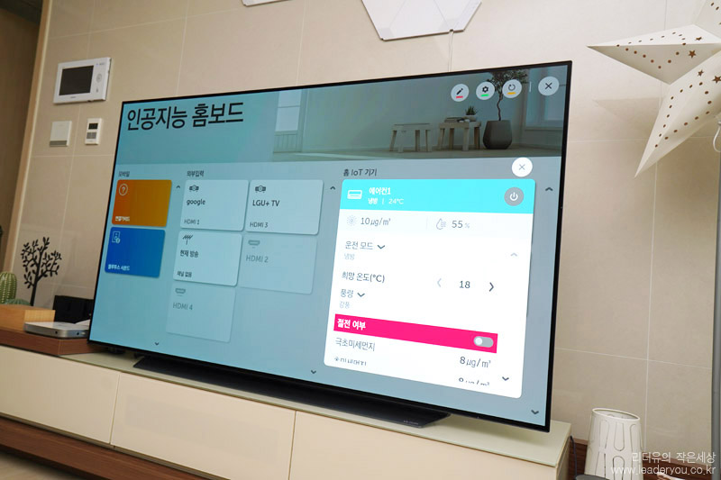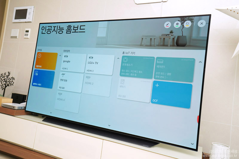 2019 LG 올레드 TV AI ThinQ 의 달라진 점에서 가장 눈에 띄는 변화는 인공지능 홈보드 기능이 생겼다는 것입니다. 집안의 가전을 TV에서 컨트롤 하는 기능인데요, 특히 LG ThinQ(씽큐) 가전이 있으면 더욱 쉽게 컨트롤 할 수 있습니다. 참고로 그 외에 OCF 인증을 받은 가전 제품이라면 모두 연동 가능한 점 참고해주세요.