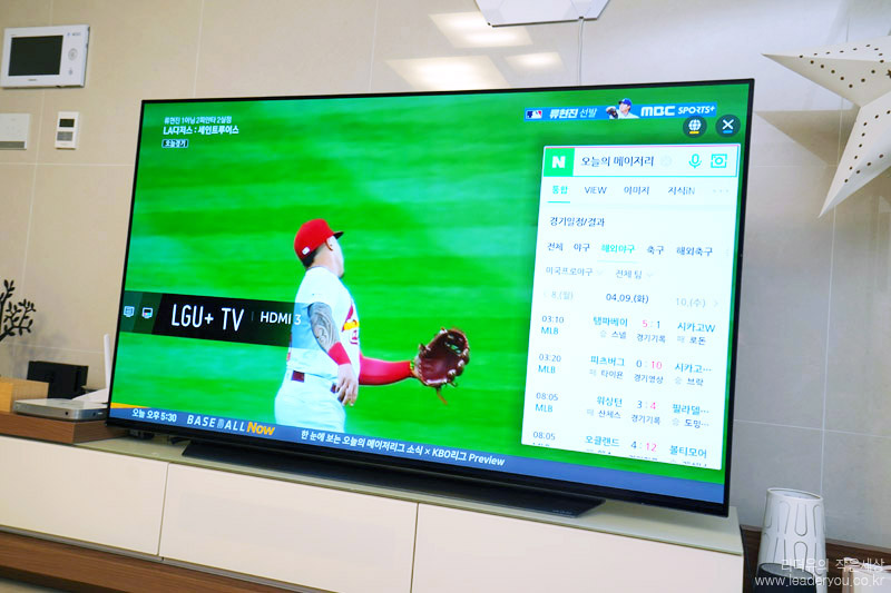 이렇게 경기를 보다가 오늘 메이저리그 일정을 물으면 구글 어시스턴트가 네이버 검색을 통해 팝업창으로 경기 결과를 알려줍니다. TV 시청을 방해하지 않으면서 정보를 보여주기 때문에 무척 편리하게 사용 할 수 있습니다.
