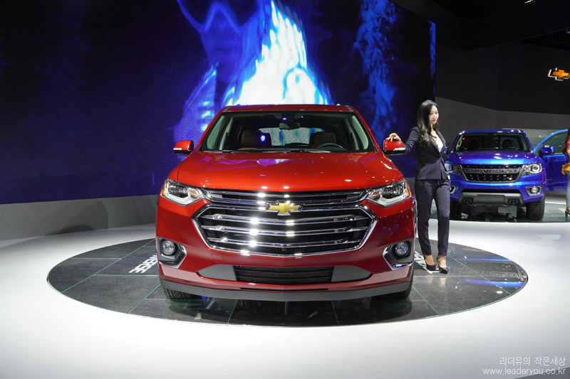 쉐보레 트래버스는 대형 SUV 답게 전면 그릴에서 압도적인 포스를 보여줍니다. 대형 그릴이 가운데 방패처럼 들어가 단단한 이미지를 느낄 수 있습니다. 캐딜락 에스컬레이드 처럼 강인한 인상을 느낄 수 있는 모델입니다.
