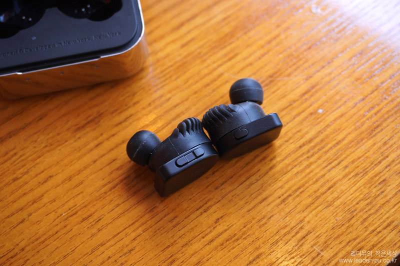 옆면에는 컨트롤 버튼이 있습니다. 왼쪽에는 볼륨 버튼이 있고 오른쪽에는 한번 누르면 플레이/정지, 2번 누르면 다음곡, 3번 누르면 이전곡, 길게 누르면 음성 인식 서비스를 호출할 수 있습니다. 버튼이라 방수가 안될 것 같지만 IPX4 방수등급으로 땀, 물 등으로 부터 안전하게 사용할 수 있는 생활 방수를 지원합니다.