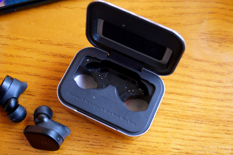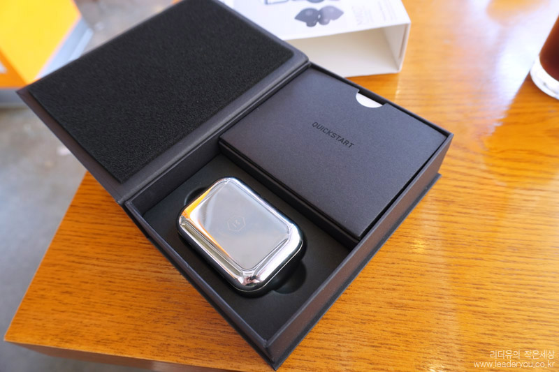패키지를 오픈하면 화려한 스테인리스 스틸 케이스가 시선을 사로 잡습니다. 소재 차별화로 프리미엄 무선이어폰의 매력을 어필하고 있습니다.
