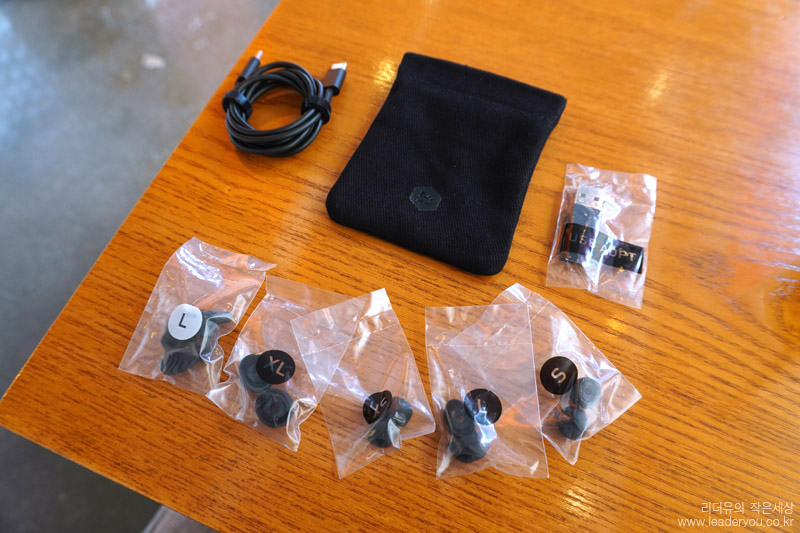 마스터앤다이나믹 MW07 구성품은 USB어답터, USB-C 충전케이블, 파우치, 핏윙 2종, 이어팁 5종이 사이즈별로 제공됩니다. 귀 사이즈에 맞게 섬세하게 착용될 수 있도록 제공하고 있습니다.