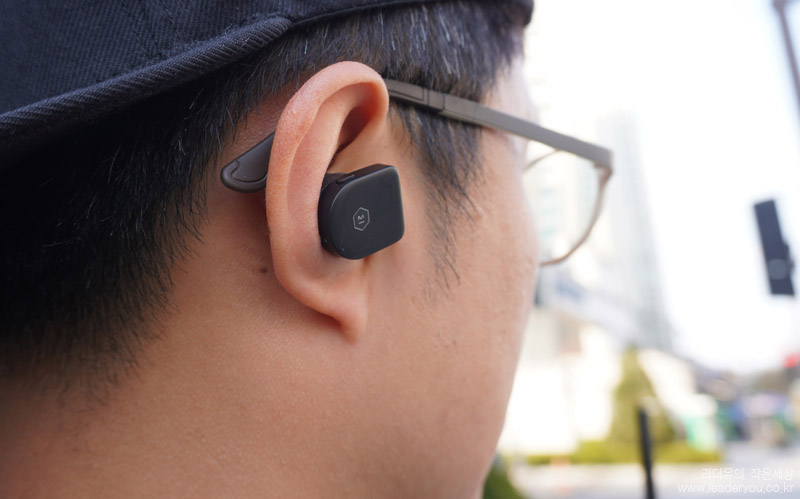 마스터앤다이나믹 MW07을 귀에 착용한 느낌입니다. 커널형 방식이고 귀에 착 밀착되서 거친 움직임에도 안정된 사용을 할 수 있습니다. 무게도 각각 9g 정도로 가볍습니다.