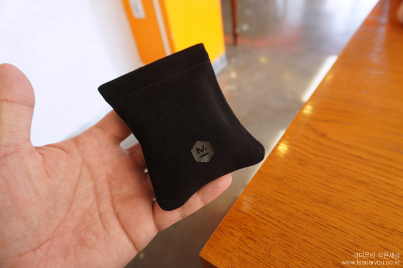 마스터앤다이나믹 MW07을 파우치에 넣은 모습입니다. MASTER & DYNAMIC을 상징하는 M로고가 들어가 있습니다.