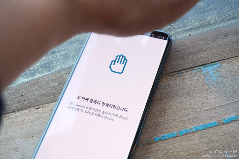 LG G8 ThinQ 핸드 아이디 1차 등록이 완료 되었습니다. 한번 더 등록을 통해 인식률을 높이는 과정에 들어갑니다.
