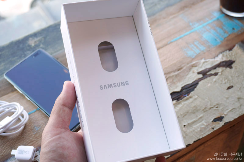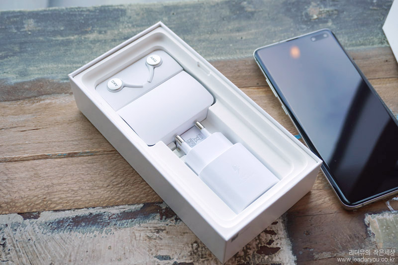 갤럭시S10 5G 구성품이 들어 있는 모습입니다. 구성품은 모두 화이트 색상으로 되어 있어 깨끗한 매력을 느낄 수 있습니다.