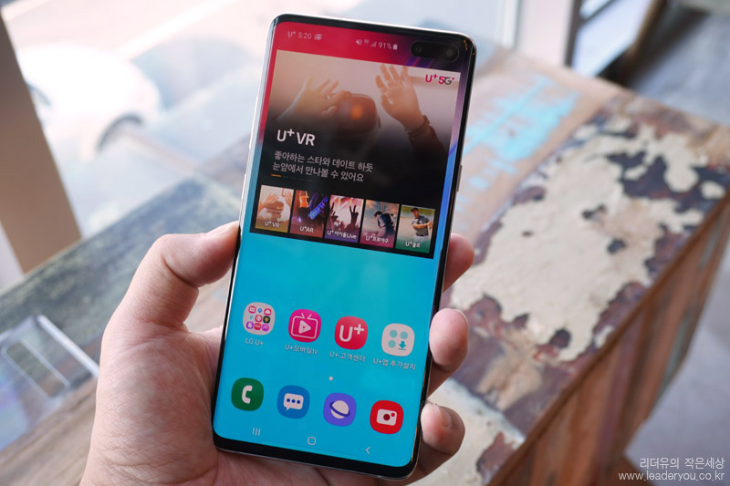 상태바를 보면 유플러스 갤럭시S10 5G를 알 수 있는 표시가 있습니다. U+ 마크가 보이고 5G 네트워크가 연결되어 있음을 알 수 있습니다.