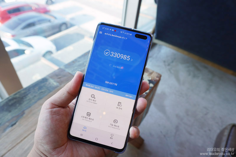갤럭시S10 5G 성능 점수를 보기 위해 안투투 벤치마크를 돌려봤습니다. 330965점으로 정말 빠른 속도를 가지고 있습니다.