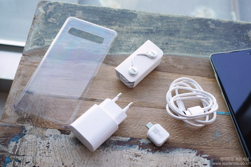 갤럭시S10 5G 구성품은 클리어 케이스, AKG 이어폰, USB-C 케이블, USB 젠더, 25W 초고속 어댑터로 구성되어 있습니다.