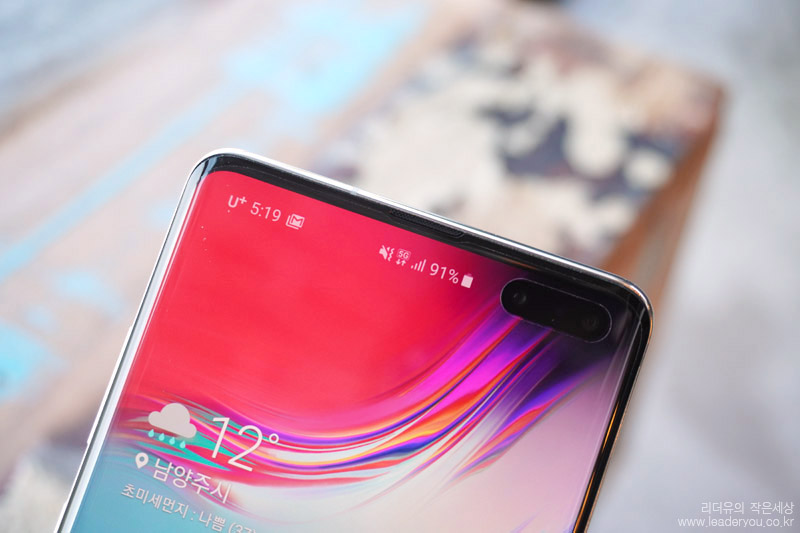 상태바를 보면 유플러스 갤럭시S10 5G를 알 수 있는 표시가 있습니다. U+ 마크가 보이고 5G 네트워크가 연결되어 있음을 알 수 있습니다.