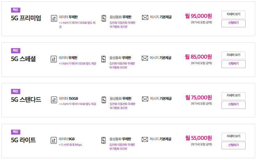 유플러스 5G 요금제는 4가지로 구분되어 있습니다. 5G 스페셜부터 데이터 무제한을 제공하니 데이터를 많이 사용하는 분들에게 적합한 서비스입니다. 5G 프리미엄을 이용하면 스마트기기 2개 월정액 무료와 100GB 데이터 나눠쓰기, 지니뮤직, 유플러스 모바일TV 기본 월정액을 무료로 이용할 수 있습니다. 5G 스페셜의 경우 50GB 데이터 나눠쓰기와 유플러스 모바일 TV 기본 월정액을 제공합니다. 1만원 차이가 있으니 각자의 상황에 맞게 요금제를 확인하고 이용하시면 되겠습니다.