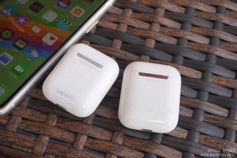 에어팟 1세대는 안쪽에 LED 램프가 있습니다. 충전 상태를 보여주는 부분인데요. 에어팟 2세대 무선충전케이스 모델은 외부에 있기 때문에 내부 LED 램프는 빠졌습니다.