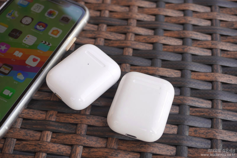 왼쪽이 에어팟 2세대 무선충전케이스이고 오른쪽이 에어팟 1세대 케이스 입니다. 전면에 점이 있고 없고로 그 차이를 알 수 있습니다.