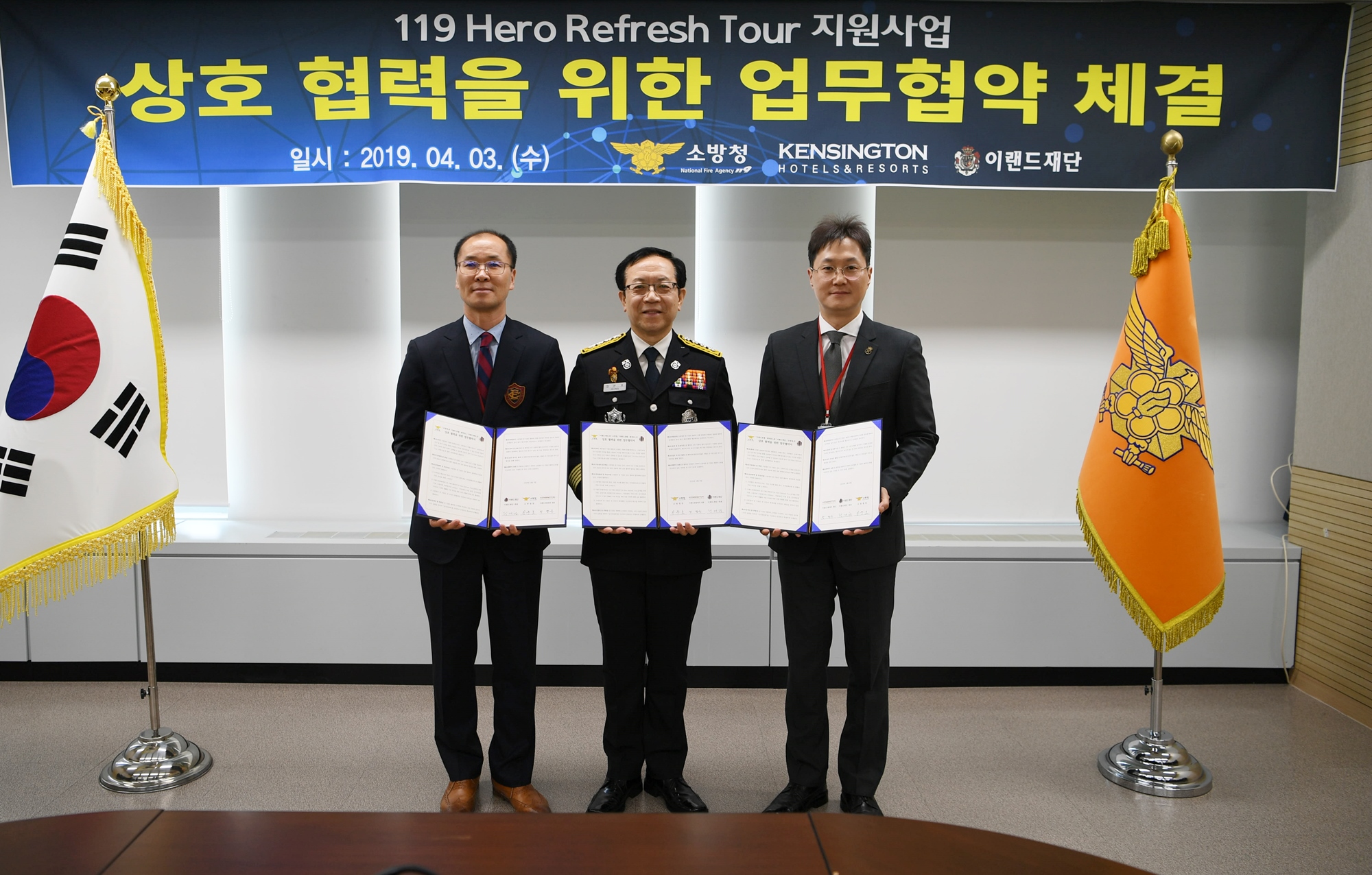 협약식 주요 내용을 보면 '소방가족 공로 리프레쉬 투어 지원'이 있고 '소방 공식 휴양시설 지정' 등이 있습니다. 리프레쉬 투어 지원 사업에는 순직 및 공상, 현직 우수 소방관 가족 대상 매월 50가정씩 국내 켄싱턴호텔 4개 지점과 리조트 11개 지점을 대상으로 숙박 및 조식, 석식을 제공한다고 합니다.