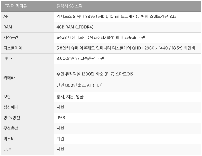 갤럭시 S8 스펙은 현재 나오는 스마트폰과 비교해서 크게 밀리지 않는 스펙을 가지고 있습니다. 카메라가 싱글이라는 점, AP가 지금보다는 부족하다는 점만 빼고는 괜찮은 스펙을 가지고 있습니다. 방수도 되고 무선충전도 지원하고 빅스비, 삼성페이 안되는게 없습니다.
