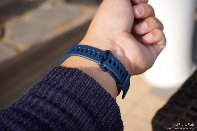 팔목에 착용한 모습입니다. 무게가 약 25g으로 가벼워서 부담없이 착용하기 좋습니다.