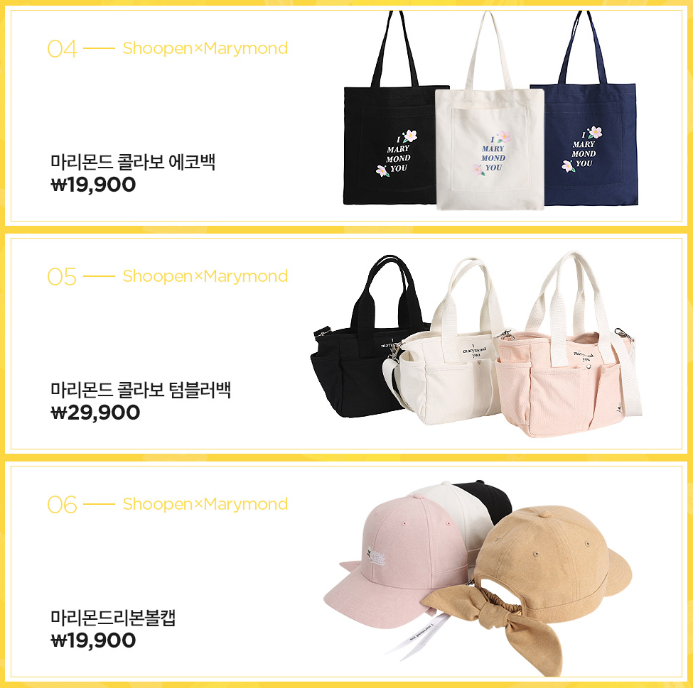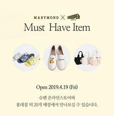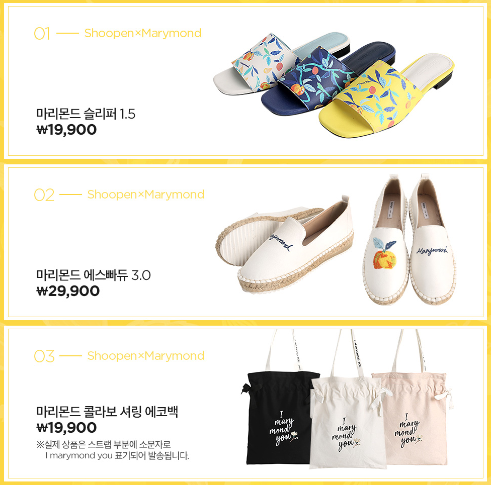 슈즈, 가방/우산, 모자로 구성된 슈펜 X 마리몬드 콜라보 상품은 가격도 착하고 디자인도 여름에 어울리는 상큼함을 느낄 수 있어 좋은 반응을 얻고 있습니다.