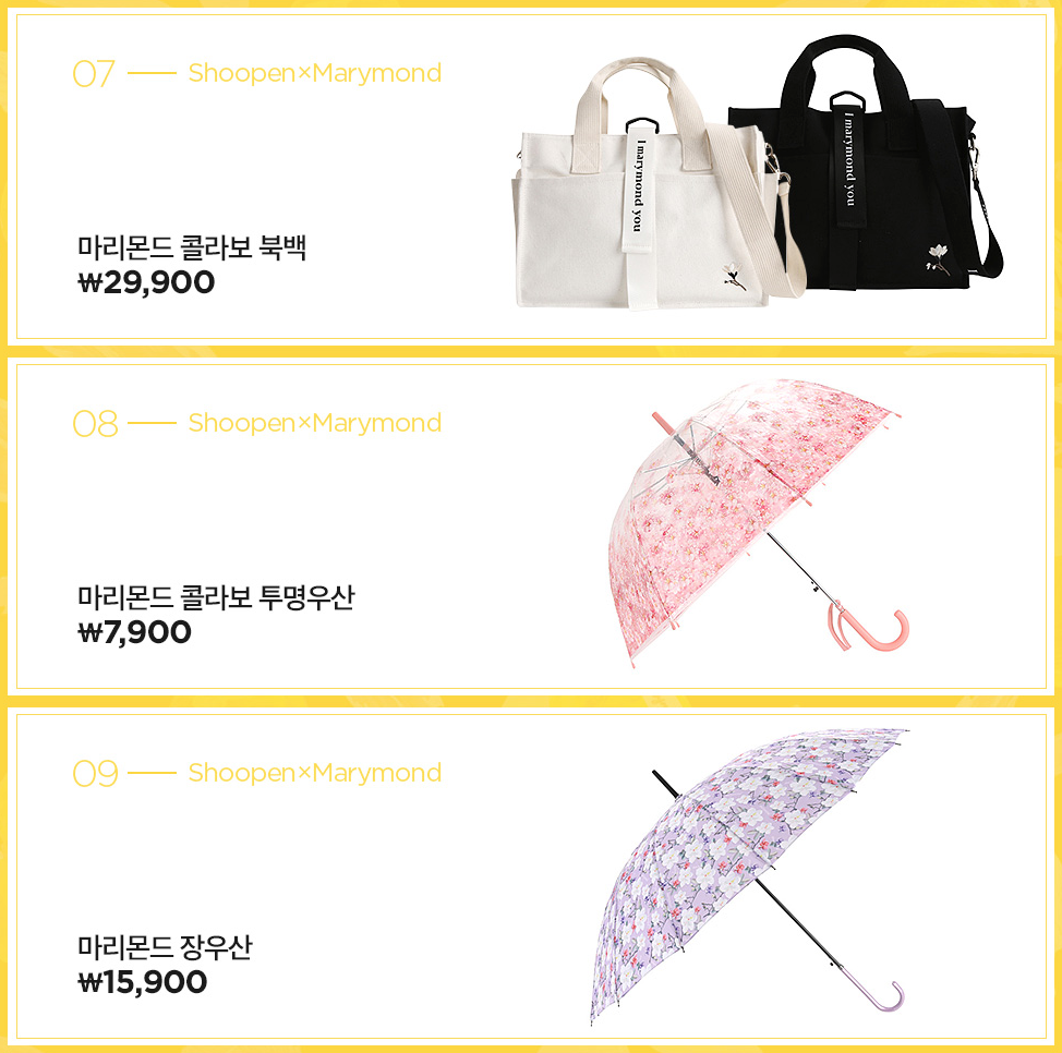 슈즈, 가방/우산, 모자로 구성된 슈펜 X 마리몬드 콜라보 상품은 가격도 착하고 디자인도 여름에 어울리는 상큼함을 느낄 수 있어 좋은 반응을 얻고 있습니다.