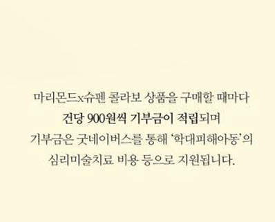 가치소비를 이끌고 있는 이랜드 슈펜 X 마리몬드 콜라보 상품! 학대피해아동들이 빨리 치유될 수 있도록 많은 관심 가져보시면 좋을 것 같습니다.