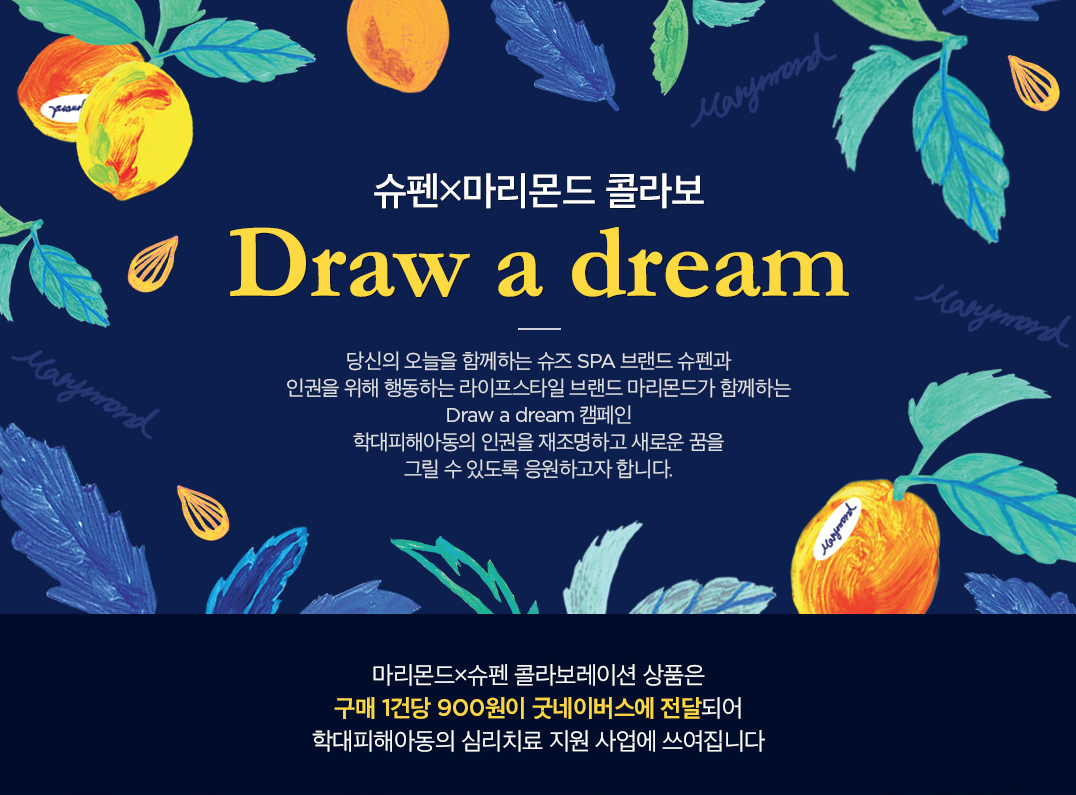 이랜드 슈펜 X 마리몬드가 학대피해아동 돕기를 위한 "Draw a dream" 상품을 론칭했습니다. 이랜드 리테일이 운영하는 슈펜은 아시아 최초 슈즈 SPA 브랜드로 가격이 착하면서 질이 좋아서 가성비 브랜드로 좋은 평가를 받고 있습니다. 슈펜이 저렴할 수 있었던건 중간유통단계를 줄이면서 가격 경쟁력을 확보했기 때문인데요. 이번에 의미있는 상품까지 마리몬드와 콜라보를 통해 진행하니 주목해 보시면 좋을 것 같습니다.