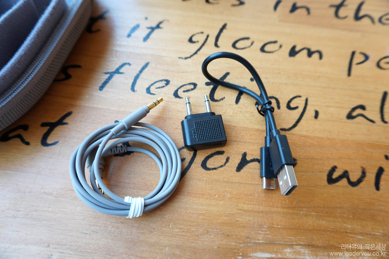 구성품으로 제공되는 헤드폰 케이블과 기내용 플러그 어댑터, USB-C 케이블 입니다. 비행기 안에 있는 컨텐츠를 이용하고자 할때는 헤드폰 케이블과 기내용 플러그 어댑터로 사용하면 됩니다.