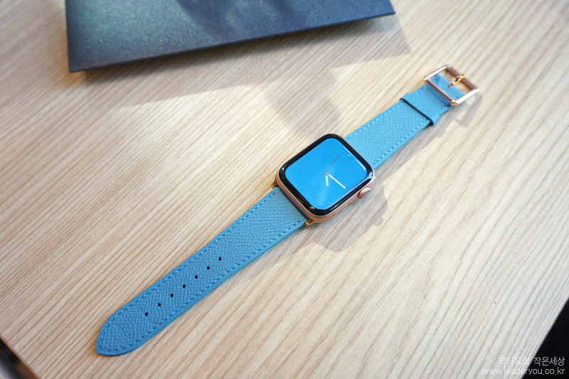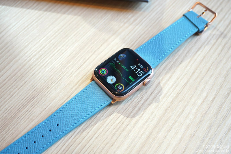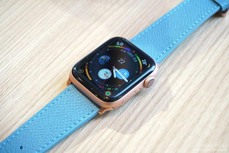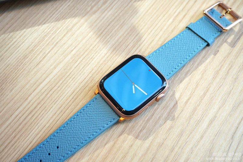 애플워치 워치페이스를 블루 컬러로 맞춰서 완벽한 컬러 셋팅을 해봤습니다. 고급스러운 가죽 밴드라 한층 애플워치의 품격이 올라간 것 같습니다.