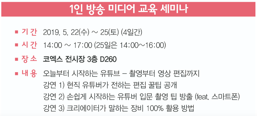 유튜브를 처음 시작하려는 분들, 관심있는 분이라면 놓치지 말아야 할 프로그램 입니다.1인 미디어 기술 강연 세미나는 코엑스 3층 D401에서 열립니다. 시간은 14:00~17:00 까지 진행되니 관련 시간 잘 체크해 두셔야 할 것 같습니다.