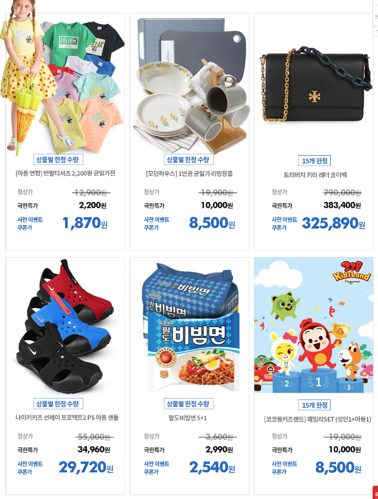 이랜드 아동브랜드 반팔티셔츠를 2,200원에 팔고 모던하우스 1만원 균일가, 토리버치 키라 레더 숄더백 15개 한정으로 383,400원에 팝니다. 그리고 나이키키즈 선레이 프로덱트2 PS 아동샌들은 34,960원, 팔도비밀면6개들이 2,990원, 코코몽키즈랜드 패밀리세트를 1만원에 판매하니 잘 활용해 보시면 좋을 것 같습니다. 15% 장바구니 쿠폰을 받게 되면 더 저렴하게 구입할 수 있습니다.