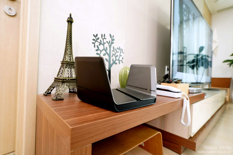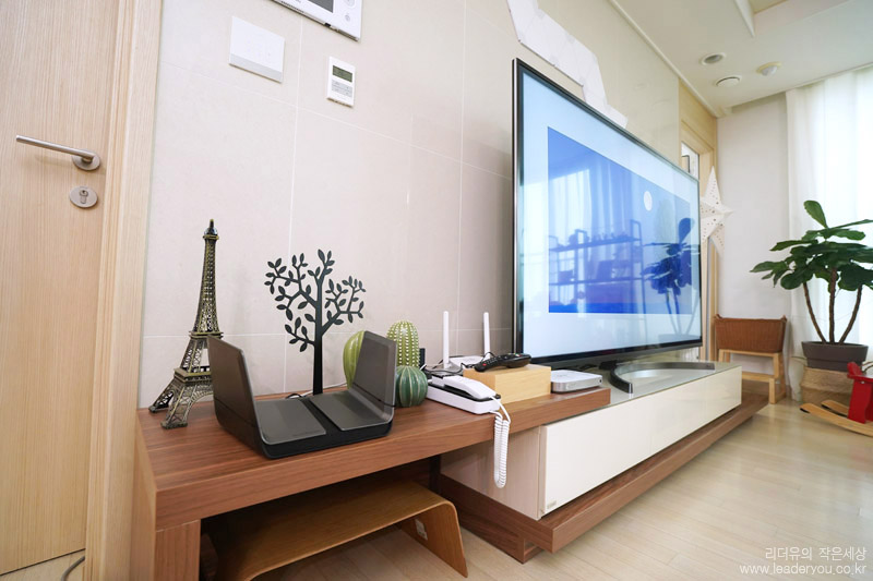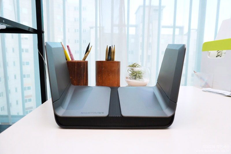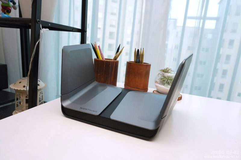 넷기어 나이트호크 RAX80을 거실에 설치한 모습입니다. 사이즈는 크지만 공유기 같지 않은 디자인이라 새로운 인테리어 포인트 역할을 해주고 있습니다.