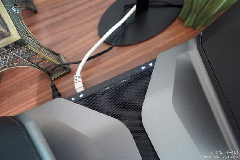 공유기를 사용할때는 날개를 펼쳐서 껴주면 됩니다. 날개에는 4개의 고성능 안테나가 들어가 있습니다.