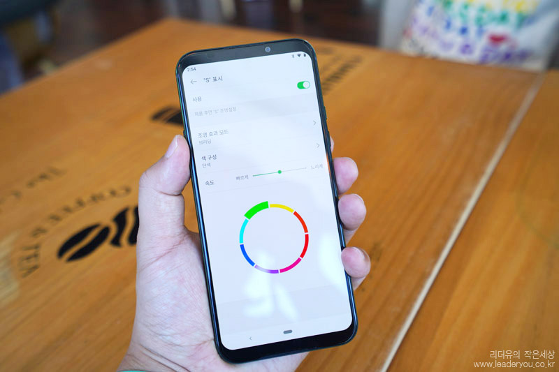 셋팅이 완료된 블랙샤크2 전면 모습입니다. 배경화면도 블랙샤크2의 컨셉을 잘 녹여내 미래지향적인 디자인을 느낄 수 있습니다. 화면 크기는 6.39인치, FHD AMOLED 디스플레이입니다. 그리고 눈의 피로도를 낮추기 위한 기술로 True View 디스플레이를 적용했습니다. 주변 환경과 밝기 및 색상을 반영해 자동으로 화면을 조정하는 기술입니다.