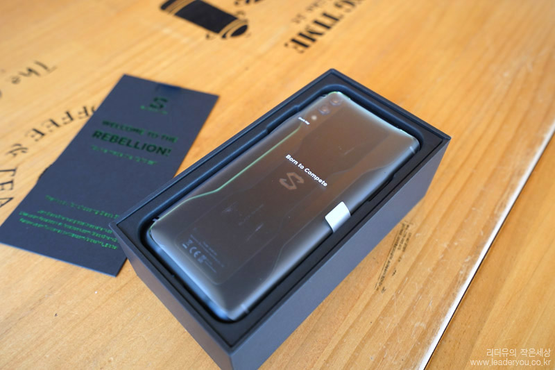 블랙샤크2 패키지 오픈을 하면 웰컴 메시지를 볼 수 있습니다. 내부에도 반짝이는 녹색 글씨로 확실한 컬러 포인트를 주고 있습니다.