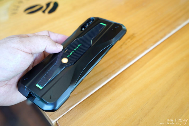 블랙샤크2 왼쪽면에는 볼륨버튼이 있고 중간 부분에는 조명바가 있습니다. 후면에 S자와 함께 양 사이드에도 조명이 있어 화려한 매력을 느낄 수 있습니다.
