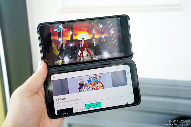 멤버별 영상을 볼때 이렇게 세로 화면으로 듀얼스크린을 사용할 수 있는 특별함도 있습니다. BTS 공연을 이렇게 볼 수 있으니 아미(Army) 분들이 엄청 좋아할 LG V50 ThinQ 가 될 것 같습니다.